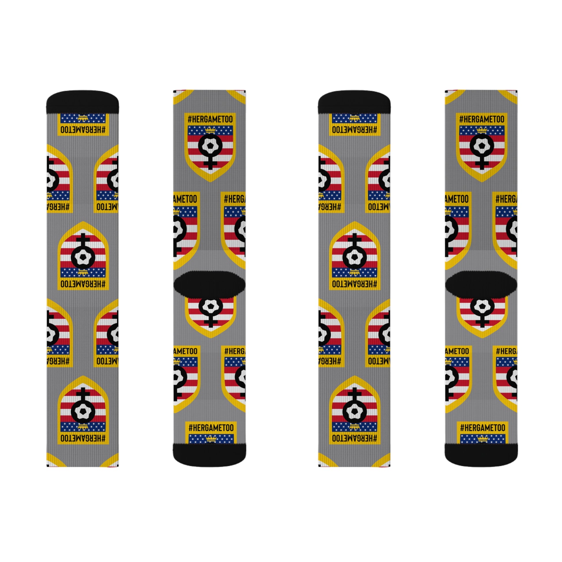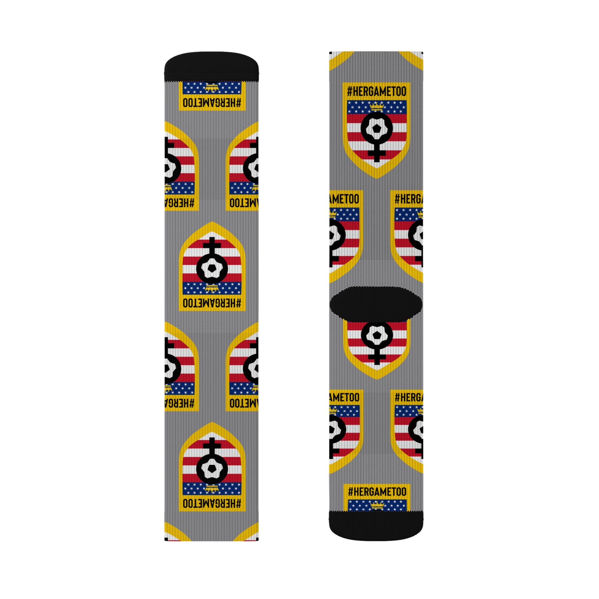 These Her Game Too USA socks are perfect for sports lovers The all-over print design gives off a fun and energetic vibe, making it suitable for casual wear or even sports events. These socks are great for sporting events. Available in 3 different sizes for a comfortable fit.